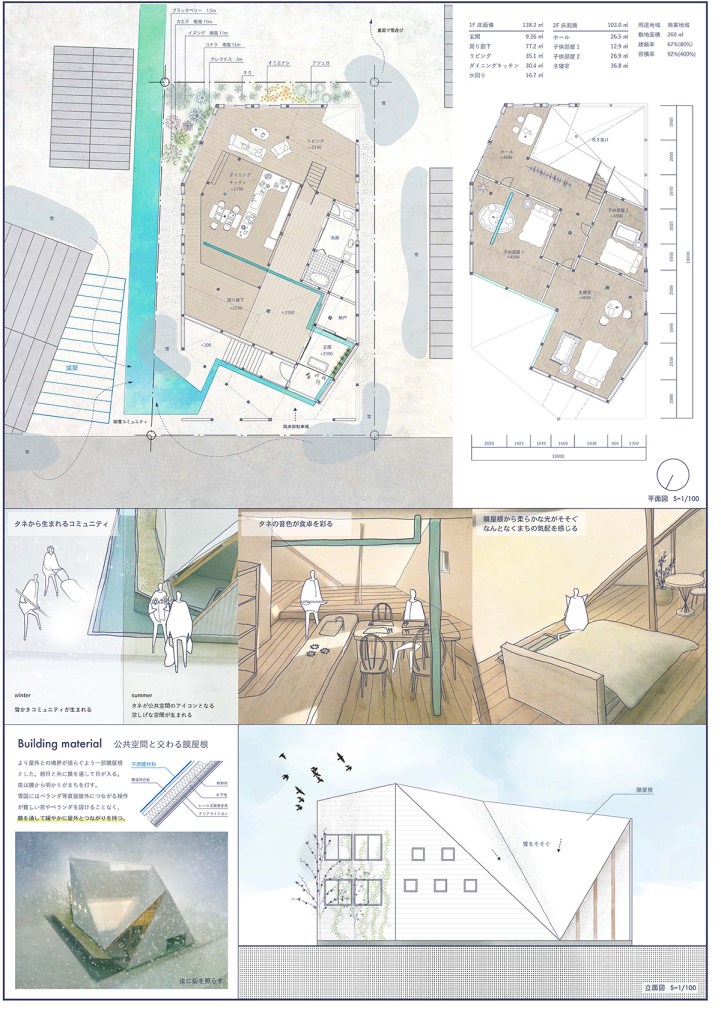 雪国に住う人々にとって雪降る季節は楽しさや美しさを感じる一方で寒さや朝晩の除雪仕事など苦しさを感じる側面もある。本計画は、雪国に根付く「タネ」と「雪」を受け入れ雪を見方にし、雪国の住まいの新たな在り方を提案する。