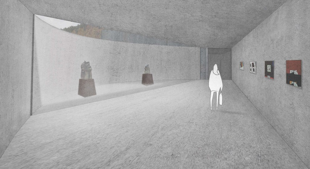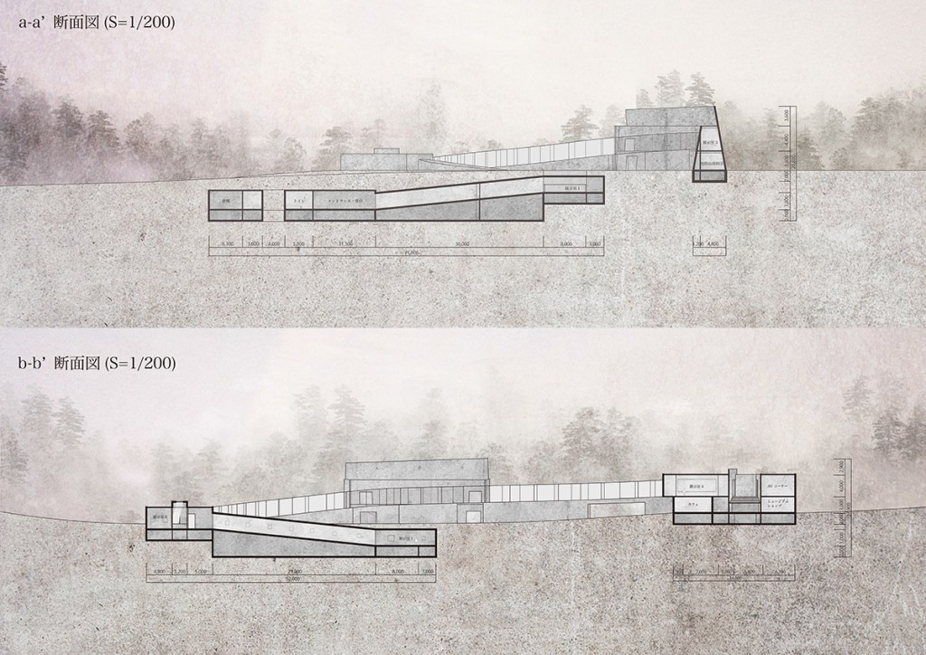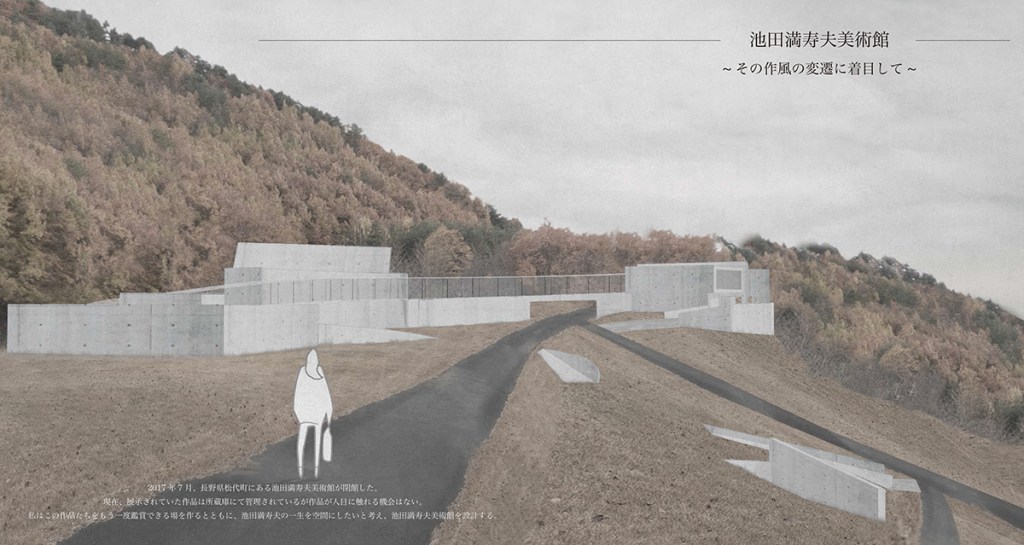 池田満寿夫(1934-1997)は、日本の画家・版画家・挿絵画家・彫刻家・陶芸家・作家・映画監督など、従来の芸術の枠にとどまらず多彩に活躍した芸術家である。1934年、旧満州国に生まれるが、学生時代の多くを母の出身地である長野市で過ごした。その後、上京し、画家として多くの成果を上げていく。1966年には、第33回ヴェネツィア・ビエンナーレにて版画部門大賞を受賞し、版画家として世界的に認められた。満寿夫の作品のテーマは一貫して「女性」であり、その官能的な作風からエロスの作家と呼ばれた。一般的に受け入れられ難い作風であることや、多岐に渡る活動から、世界的に活躍したにも関わらず満寿夫の認知度は他の画家に比べて低いのが現状である。また、満寿夫が死去した1997年に新設された池田満寿夫美術館は、約20年の開館を経て2017年に閉館した。この美術館に展示されていた作品は現在も所蔵庫に収容されており、人の目に触れることなく眠っている。そこで、本計画では、満寿夫の作品をもう一度鑑賞できる場を作るとともに、満寿夫の生涯を体感する美術館を設計する。具体的には、満寿夫は生涯で四人の女性と交際し、その出会いによって作風の変化が見られることから、四つの展示空間に分けることでその変化を感じる構成とした。また、満寿夫の出身校である長野高等学校が見下ろせる地附山公園を敷地に選定し、その斜面地という特性を活かしながら、来訪者が地中から地上へと緩やかに登りながら作品を鑑賞することで、満寿夫の低迷期から栄光を掴むまでの画家人生を体感できるような施設を意図した。満寿夫の生涯を辿り、所縁ある場所との調和の中で、鑑賞者が満寿夫の作品に対する理解を深めていけるような建築空間を目指した。
