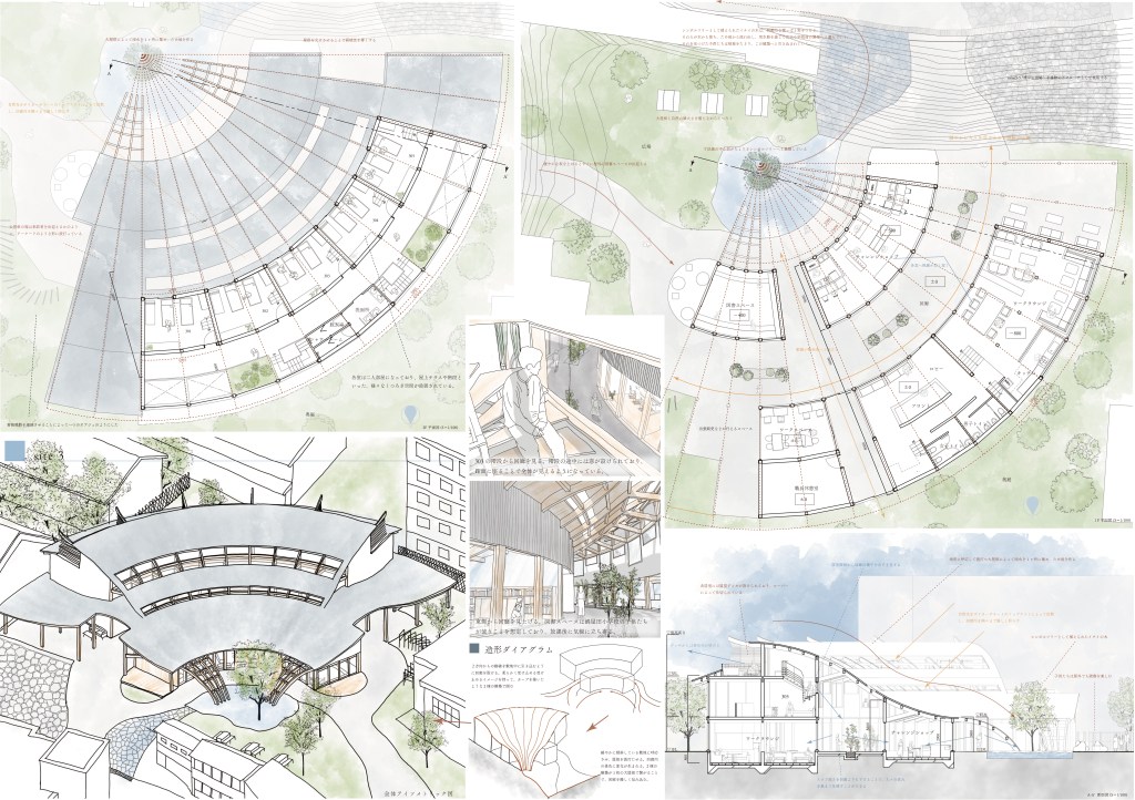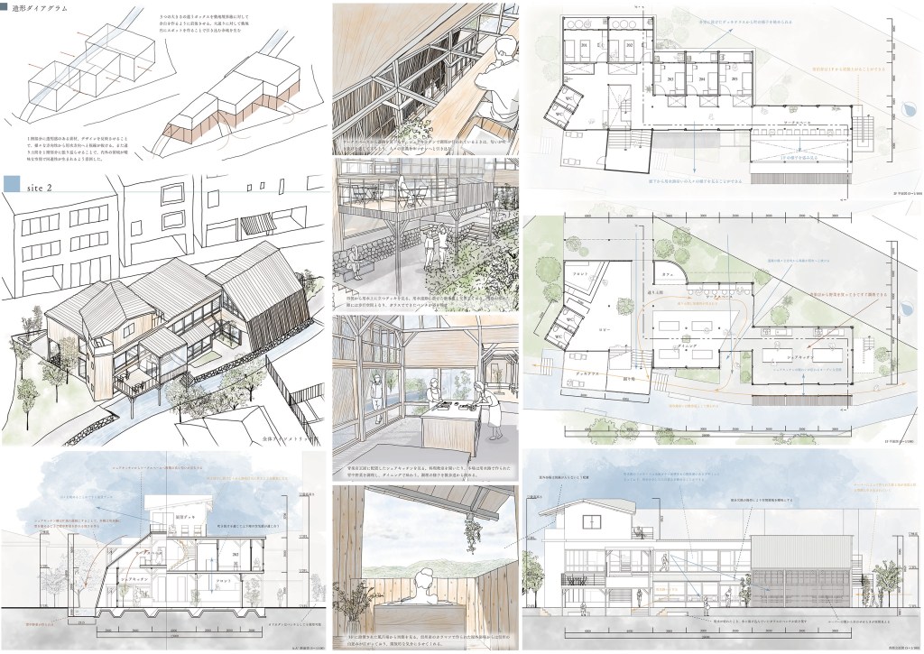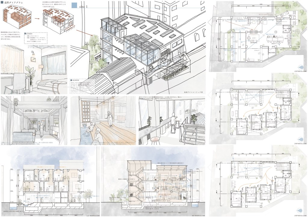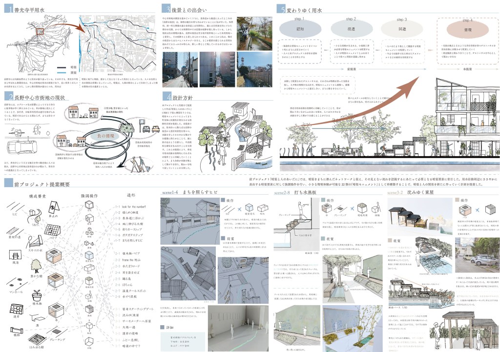 長野市には用水が張り巡らされている。その中でも、善光寺平用水と呼ばれる農業用水は、裾花川から取水した長野中心市街地の用水の源流であり、長い間多くの人々の生活を支えてきた。しかしながら都市開発が進むにつれ、用水は暗渠化し、人々の生活と水の関係は希薄になっていった。暗渠は人間の都合によって出来てしまった都市開発の負の遺産と言えるが、見えないからこそ、暗渠は街に潜むネットワークとしてのポテンシャルを持ち、人々が寄り添う余地がある。都市の裏側だからこそ生まれた風景が存在する。前プロジェクト「暗渠と人のあいだに」ではこの見えない流れを利用し、用水沿路に存在する「暗渠要素」に対して強調操作を行い、「暗渠モニュメント」として再構築することで、水路上に環境体験を孕む歩行空間を設計した。その結果、街に人々の短期的滞在、回遊のきっかけが生まれた。その計画の延長として、本計画では水路沿いに地域住民が集い、交流可能な共有空間を持つゲストハウスを3つ提案する。それぞれの敷地が持つ特性の分析による手法の他に、共通の設計手法として水路沿いに点在する街の要素を抽出し、それらを元に人々の活動、居場所創出を行う方法を提案した。これにより水路を介したささやかな繋がりを感じつつ、裏に溶け込むような暮らし、中長期的な滞在が生まれる。前プロジェクトと合わせて、善光寺用水沿路が段階的に、それぞれの場所ごとに再編していくことにより、街全体が水路を軸として繋がりを持ち、賑わいを取り戻していくことを目指した。(JIA 第32回 長野県学生卒業設計コンクール 大学の部 奨励賞)