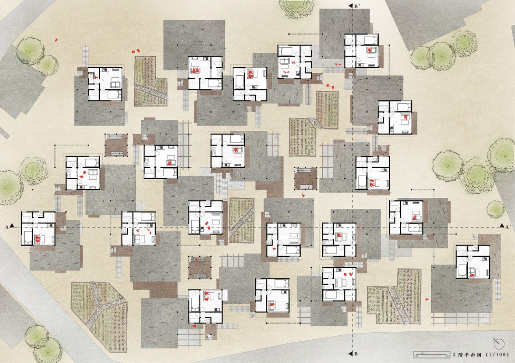 集合住宅における集まって住むことの本質的な意味とは 「共有」することである。現在の集合住宅においてよく見られる、住戸を並べて積層させるような建築は空間を効率よく組み立てるという点で合理的である。しかしながら、住民同士の関係性や空間の外部に対しては無関心であり、「共有」という集まって住むことの本質的な意味が失われつつある。そこで、建物に詰め込まれ内向的な「住戸」を住民の活動が表出する外向的な「住宅」として捉え直し、「共有」することについて多角的視点から紐解くことで集合住宅の在り方を再編する。具体的には、「自然環境の共有」「空間の共有」「情報の共有」「知識の共有」「あらわれの共有」の5つの視点から集合住宅の再編を行なっていく。自然環境の共有では、水・光・風の循環を考える。空間の共有では、内部空間と外部空間の間に存在する中間領域に着目し、共有の空間への発展を考える。情報の共有では、集合住宅内に隣組制度と回覧板制度を取り入れた新しいシステムの構築を考える。知識の共有では、長野県も推進する暮らしの中に農業を取り入れた「農ある暮らし」を考える。あらわれの共有では、各住宅から表出する「もの」や「思い」をあらわれと捉え、3次元的近隣関係による各住宅からのあらわれの伝播を考える。このように、「共有」が敷地全体、住宅間、住民間など、多様なスケールで発生することにより、集まって住むことの本質的な意味を見つめ直すような集合住宅を目指した。(JIA 第32回 長野県学生卒業設計コンクール 大学の部 市民賞/NAGOYA Archi Fes 2023 田中義彰賞/せんだいデザインリーグ2023卒業設計日本一決定戦100選)