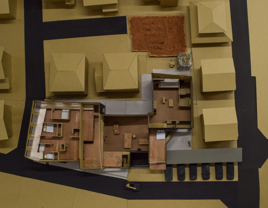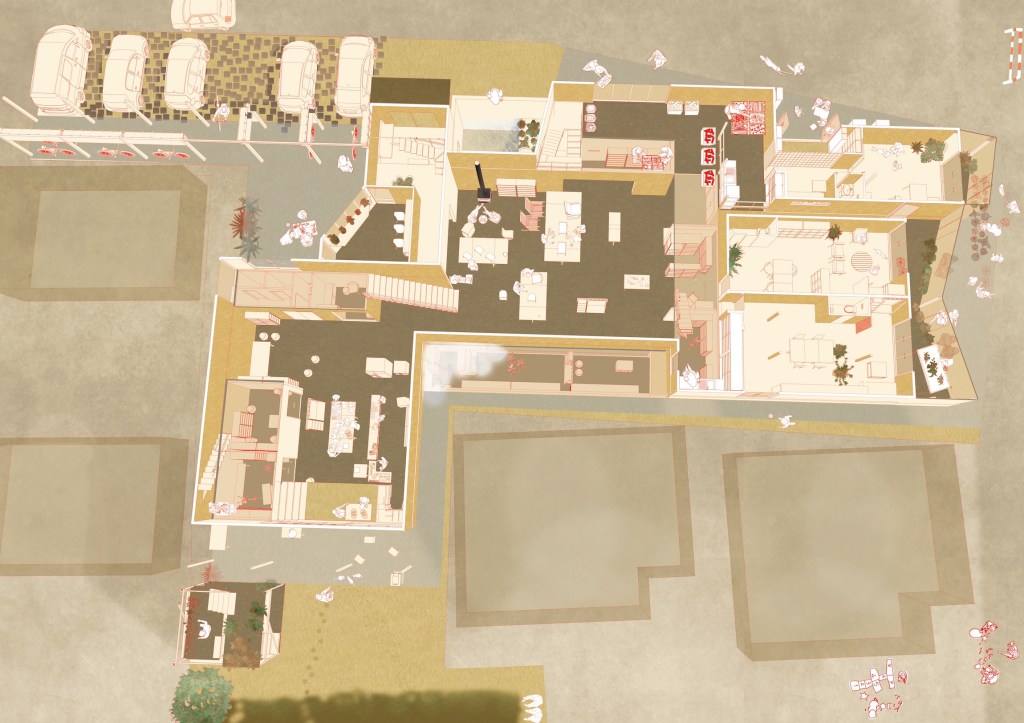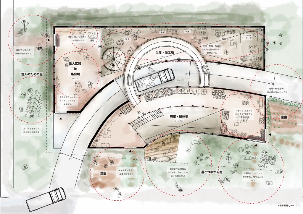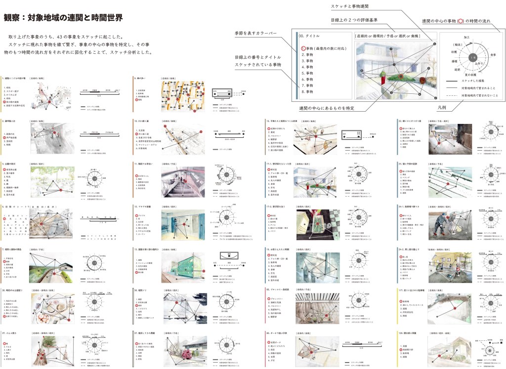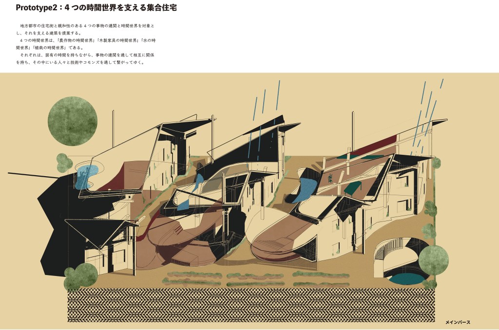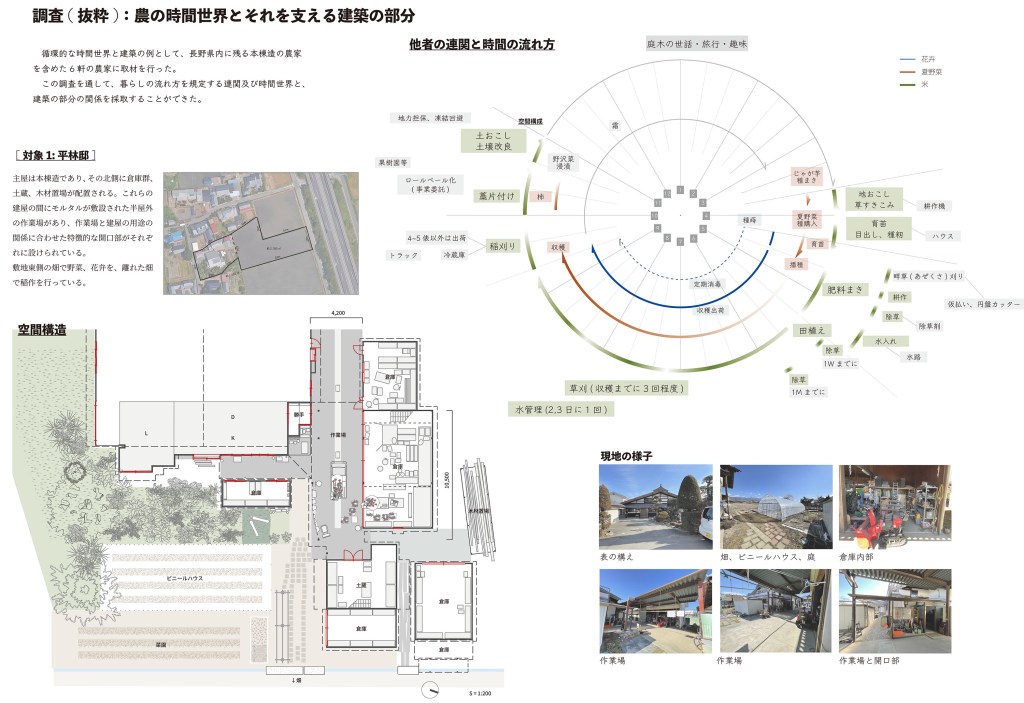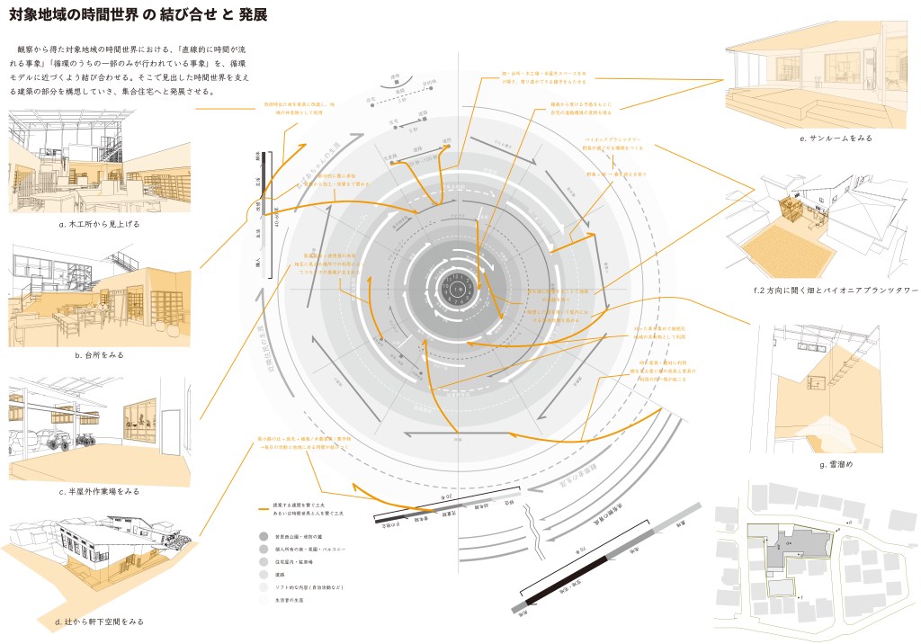本研究は、人以外の事物(以下、他者)の連関の中で認識される時間世界(正確に進み、戻らない時間の進み方ではなく、時にゆらぎ、ある周期で同じ営みが戻ってくる時間の進み方を指す)の視座をデザインに取り入れることによって新たな地方都市の住宅街の像を描く試みである。地方都市の住宅街は、資本主義を象徴する存在の一要素であり、そこにいる人々の暮らしはその人工的な構造を維持するための商品であると捉えられる。そこには核家族を基本単位とする政策-金融-交通を軸とする連関があり、教育機関-職場-老後といった所属を軸とする時間世界がある。この連関及び時間世界が要因といえる社会問題の中で特に、暮らしの中で循環する自然環境との共生関係を原則持たないこと、労働と暮らしをより遠ざけたことを問題として捉える。本研究では、他者の連関の中に人がいることを前提に、地方都市の時間世界を分析し、それを活かしながら循環型に転換させる設計提案を行い、自然環境及び近隣と個人が共生関係をもつ暮らしを構想した。転換後の時間世界は、資本家に労働力を搾取される構造、及び経済合理的に農を営む構造を退け、持続可能な精神の安定を基にした循環する暮らしの成立を支える基礎となる。研究は調査と設計提案からなる。調査において、農家の暮らし及び長野市若里5丁目9番地、10番地(以下、対象地域)の暮らしにおける、事物連関の様子と時間の流れ方を分析した。農家の暮らしの調査から関係的時間(複数の事象の持つ時間と個人が関係し合う際の時間の流れ)の時間世界とそれを支える建築のあり方を読み取り、対象地域の調査から対象地域の時間世界を捉えた。上記の調査を踏まえ、特定の事物の連関とその時間世界を支える建築を試行した。ここでは、木製家具を軸とする連関における時間世界、職人が集まって住まう時間世界、土を軸とする時間世界の3つをそれぞれに支える建築のあり方を検討すると共に、土間の有効性を活かす形態を検討した。最終的に農作物、水、木製家具、植栽を軸とする時間世界を支える建築を構想した。設計提案において、対象地域の時間世界を支える集合住宅の建替を提案した。調査から得た対象地域の時間世界では、個別の連関が直線的に消費される事象が多く確認できた。提案した建築では、それらの各連関を繋ぎ合わせる機能を持たせることで、対象地域の時間世界を循環型に転換させることを目指した。(トウキョウ建築コレクション2023設計展 次点作品)