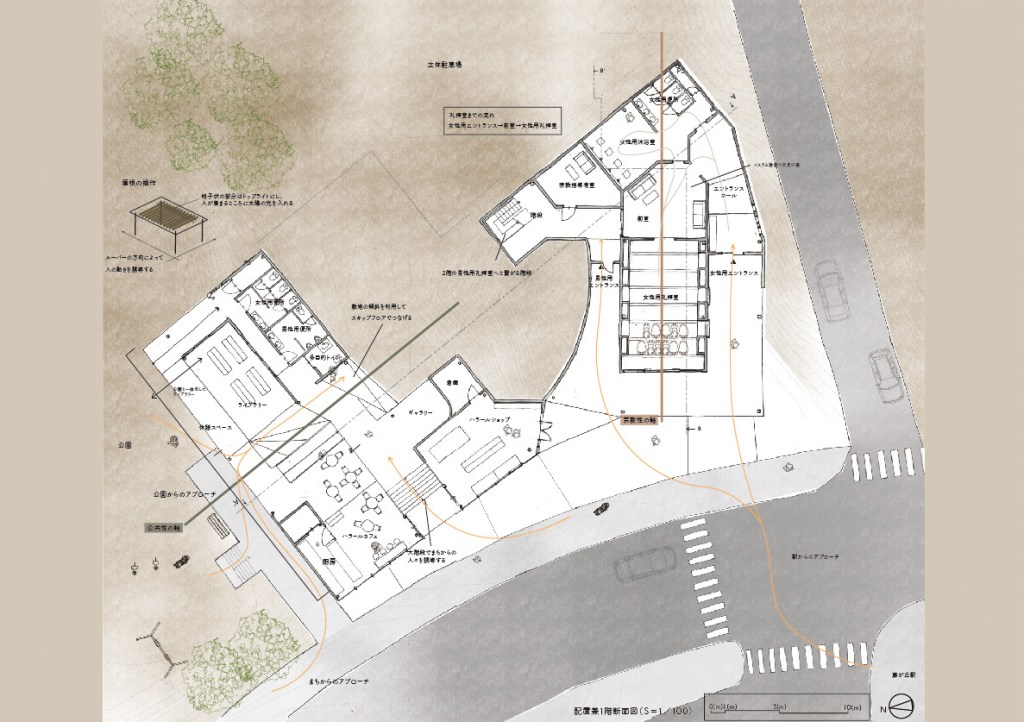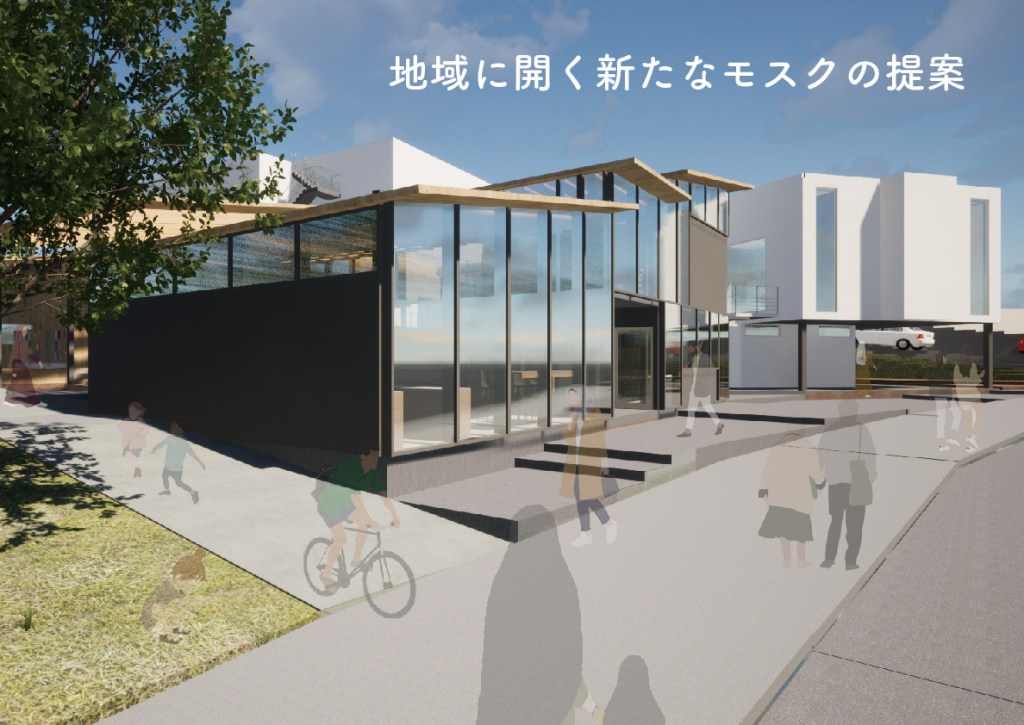 モスクはイスラム教の礼拝堂のことである。日本における大半のモスクは、民家や事務所ビル、工場などを転用して利用しており、そのため、モスク周辺の地域住民による認知度が低く、地域においてモスクが閉鎖的で入りにくい場所となっているのが現状である。そこで本計画では、イスラム教徒に限らず、地域住民にも親しみを持たせることを目的として、「地域に開く宗教建築」のあり方について検討し、神奈川県横浜市青葉区藤が丘地区において新たなモスクと融合する地域交流施設を提案する。具体的には、イスラム教徒と地域住民のかかわりを持たせるため、公共の場である駅前公園に隣接する場所を敷地として設計を行う。まず、モスクの設計手法としては、建物の存在が地域に溶け込みつつ、かつ荘厳な空間を構成するため、代表的なモスク建築で見られる特徴や礼拝行為における重要な要素を抽出し、これを抽象化したファサードや内部空間の意匠とした。礼拝室は、教義により定められた礼拝の向きを主軸として配置することで、軸を重視した計画とした。また、地域交流施設は、ハラール イスラム教徒が食べてもよいとされる食品 ショップやカフェ、シェアキッチンを設け、イスラム教徒と地域住民の交流の拠点となる他、イスラム教徒の活動を可視化することで発信拠点ともなる。モスクと地域交流施設は、それぞれ中庭と公園と繋げることで、誰にでも利用しやすい施設となること意図とした。