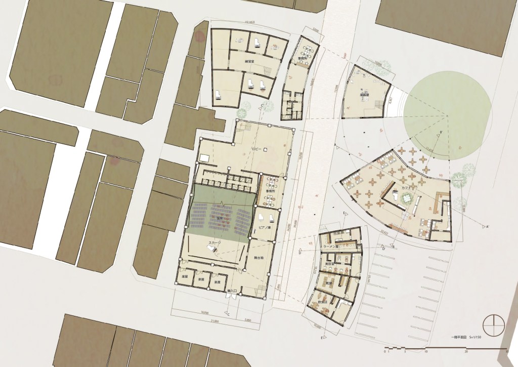 現代社会では、音楽を気軽に楽しめる環境が整っている一方で、イヤホンやヘッドホンを通じて一人で音楽を聴くスタイルが主流となり、音楽を共有したり生演奏を体験したりする機会が減少している。このような背景から、音楽を共有し体験するものとして捉えなおすことで音楽の持つ力や価値を再認識し、それを地域社会に広げるべきであると考えた。本計画では、北陸新幹線の開業を契機に再開発が進む福井駅前「ガレリア元町」商店街を対象敷地とし、地域主体の音楽施設を提案する。福井県では、ヤマハとの提携による「オトマチ」事業を通じ、地域の音楽活動が積極的に支援されている。本施設はその取り組みを拡張し、音楽を活用した地域の活性化を図ることを目的とする。具体的には、中央に音楽演奏が可能な広場を配置し、その周囲に楽器店や飲食店を設けることで、どの場所からでも音楽が楽しめる環境を構築する。また、広場から奥に賑わいを引き込む形で音楽ホールを設計し、地域の音楽団体やプロの演奏家による幅広い音楽活動を支える場とすることを目指す。さらに、かつて商店街であった記憶を継承するため、直線的な通路を残しつつ、音楽の広がりを象徴する円形のデザインを取り入れ、新旧の特徴が調和する空間を創出する。これにより、駅周辺に音楽が響き渡り、訪れる人々が新しい音楽体験やコミュニティに触れる機会を提供することが可能となる。そして、音楽を媒介とした地域交流を促進し、福井駅前に新たな賑わいをもたらすことを目指す。