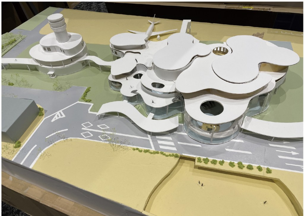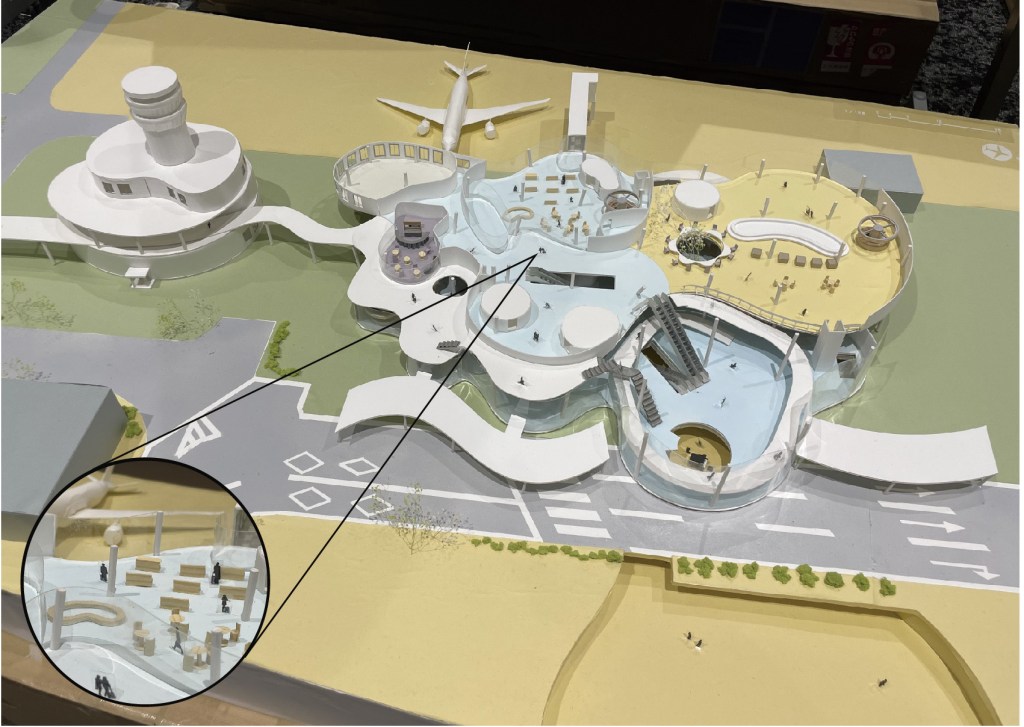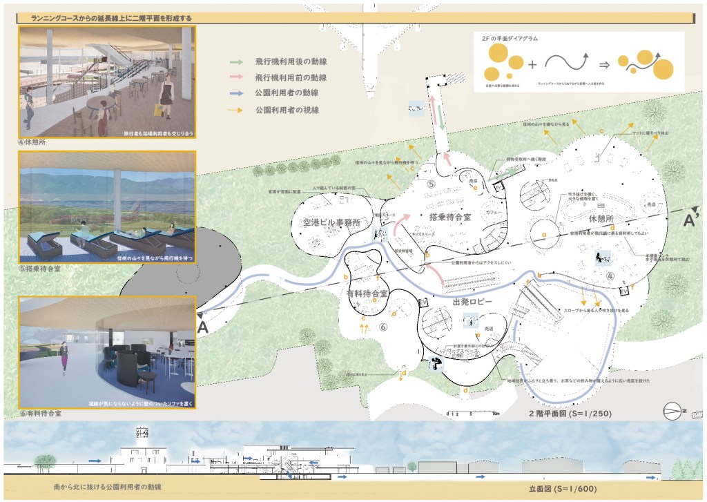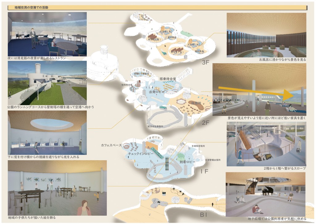 長野県の唯一の空港である信州まつもと空港は信州スカイパークという広大な公園に囲まれている。公園は地域住民の散歩や運動の場として親しまれているが、安全柵や長い滑走路が物理的な塀となり空港は飛行機搭乗者以外は立ち寄る機会がほとんどない。そのため空港は地域住民から遠い存在となっている。さらに、信州まつもと空港は発着便や使用時間の制限が厳しく、コストが高いため地域住民から使い勝手の悪い空港とみなされている。このような問題は地域住民の空港への関心が薄れていく一つの原因となっている。そこで本計画では、地域住民が日常的に利用できるような場となるよう空港の再生を提案する。空港と公園を繋ぐ歩行者用通路をを設けることで地域住民の生活動線に空港を取り込み、さらに空港内に浴場施設を設け、地域住民や旅行客だけではなく、新しく計画されている競技場を利用するアスリートも利用可能な計画とした。具体的な空間設計としては曲線を採用し、空間を緩やかに区分することで利用者同士が自然に交わる場になるようにした。例えば、搭乗待合室やカフェスペースなどにおいて曲面を活用し、滞在者がくつろぎながら空港全体を見渡せるデザインを意識した。また、屋外の展望台では飛行機と信州の自然を一望できるよう曲面を前に張り出したデザインした。さらに、休憩スペースを浴場施設、空港、公園それぞれの動線に組み込むことで、利用者が一体化した体験を得られるよう工夫した。 以上のように、信州まつもと空港を信州スカイパークとの連携を通じて地域住民が集う新たな公共施設として再生することにより、空港が交通の拠点として離れた地域を繋ぐだけでなく、地域活性化を促進する施設となる可能性を提示したいと考えた。(日本建築学会 2025年度支部共通事業 第66回全国大学・高専卒業設計展示会 出展作品)