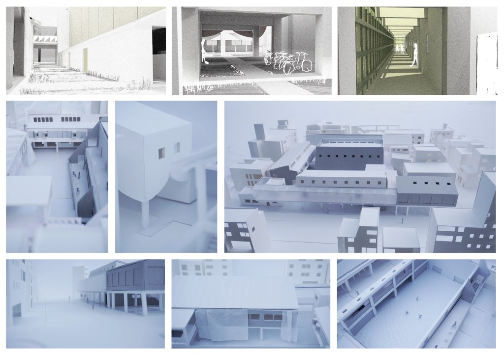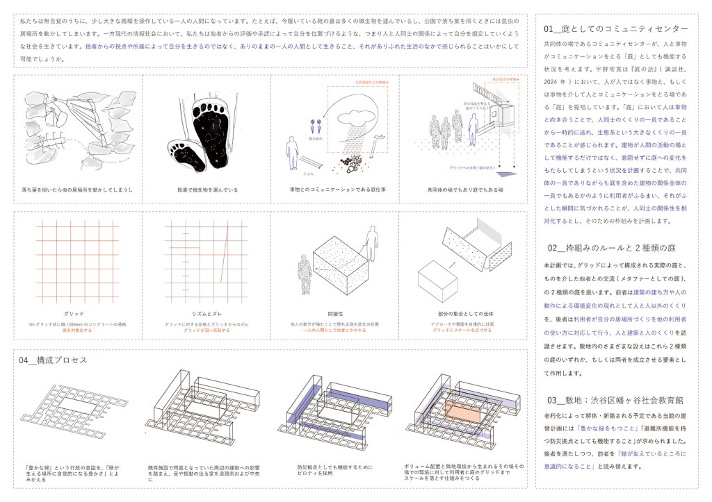 本研究では、情報社会や共同体において生じる人間同士の相互承認によって駆動する共同性を、建築空間を通して相対化することを目的とする。 今日の情報社会を生きる私たちにとって、SNSの仕様の変化は、自分の住む地域の問題よりも、はるかに自分事として感じられる。これは、タイムラインという公的な場に「投稿」することがあまりに簡単に世界への関与を実感させてしまうことによる。タイムラインの潮目を読むような相互承認のコミュニケーションは社会の多様性を縮減してしまうのではないだろうか。 『庭の話』(講談社、2024年)において宇野常寛は、こういった共同性を相対化する術として、「庭」という場に注目する。こうした議論を参考に、本研究では、庭を、人間の行為や建築の物理的ふるまいが環境へ漏れ出し、その痕跡が蓄積されることで、人間と事物の関係が立ち上がる場として捉えた。そのような庭的な場に触れることで、私たちは共同体の一員という単一の帰属に加え、生態系の一部としての帰属を意識する。すなわち、共同性の相対化は、帰属先の複数化によって可能となると考える。 ここでは、情報社会のプラットフォームにおいて簡単に得られてしまう世界への手触りに対して無力であるとされてきた公共施設を、建築の構成によって共同性の相対化の場として再構築することを考える。 敷地は東京都渋谷区幡ヶ谷に位置する都営住宅跡地である。甲州街道から水道道路へ北上するように伸びる六号通商店街に面し、北側に地域コミュニティの活動拠点となっている渋谷区立幡ヶ谷社会教育館が建っている。現在渋谷区による社会教育館の建替えと都営住宅の新設が敷地において計画されており、本計画はそれに対するオルタナティブとして提案する。 ある用途および建築空間の構成を、他の要素(庭、他用途、隣接建物)の部分として計画することで、活動のスケールや利用者によってその場所の意味が変化するような多元的な環境を生み出す。つまり共同体のための場が、庭や他用途からの物質的影響を受け取るように計画することで、利用者は建築を介して存在する多元的な環境の一員であることに気づくことのできる状況を設計する。