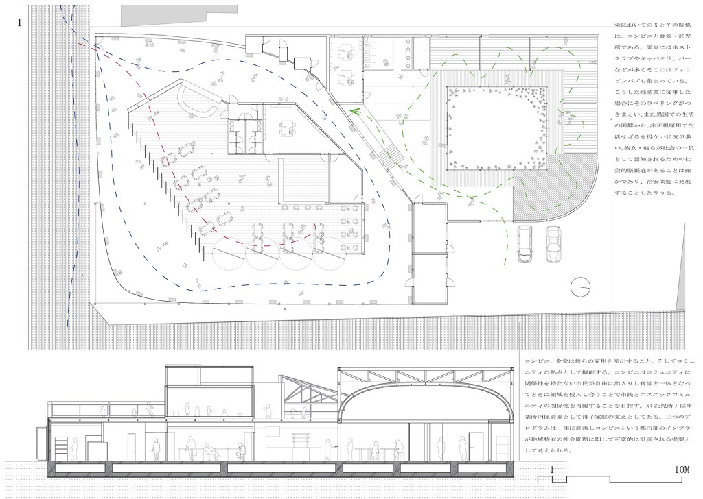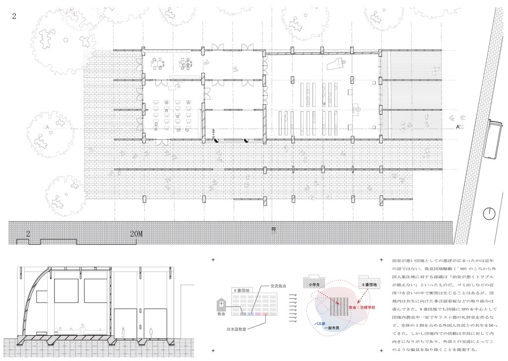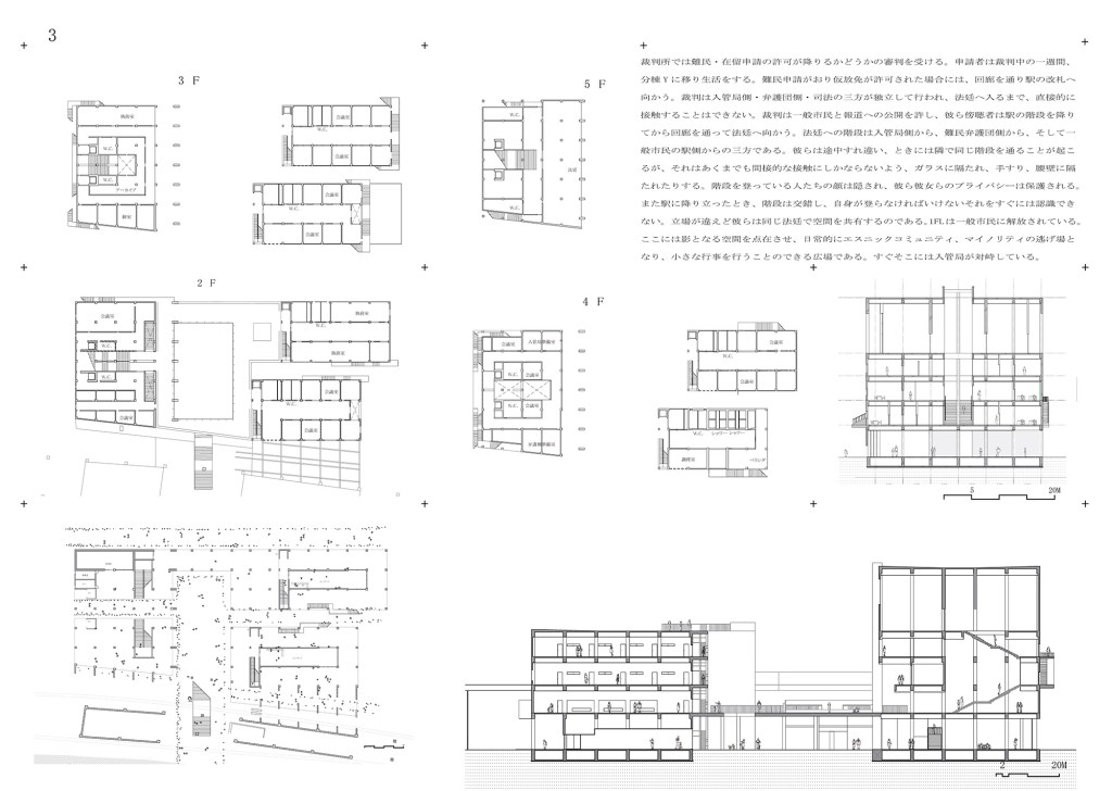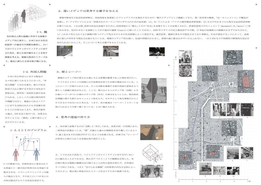 本計画は、人間の認識に作用する建築のメディア性に着目し、日本における社会的弱者への偏見や不理解を解消し、ひいてはマジョリティのマイノリティに対する行為を、彼ら自身が顧みることを促す建築を構想する試みである。ここでは、日本におけるエスニック・マイノリティ(民族・文化的少数者)と日本人の関係性を題材に考える。愛知県名古屋市の外国人居住者数は、全国的に見ても多く、約10万人(令和6年末時点)を超えている。本計画では、その名古屋市内でも特に外国人社会としての特徴が顕著な地区である栄東、9番団地、名古屋入管局周辺を敷地とし、社会的弱者を対象とした用途と一般市民が利用できる用途を複合した施設を提案する。具体的には、上記の順に母子支援施設・食堂とコンビニ、教会とバス待合所、裁判所と駅といった組み合わせである。これにより、日本人と在留外国人の交流における関係性を再編するとともに、建築によるモニュメンタリティによって、官民へのバタフライエフェクトの発生をめざす。現在の情報社会において情報接触の画一化は激しく、同一の意見が集積することによって起こるエコーチェンバーが指摘されている。情報の加速化に伴うメディアの在り方は、情報を知覚する方式においても変化していくことが考えられる。これを踏まえれば、形として存在する建築が発揮するメディア性を、人間の知覚を新たな方式に転回する要素として用いることができるのではないだろうか。これまで、ときに建築は過去の記憶を継承するためのモニュメントとして活用されてきた。これに対し、それ自体に帯びる意味が流転する性質の実現を模索することで、今現在の状況を批評的に表象するメディア的性質が発露されると考えた。ここで示す新たな知覚方式は、加速的に追加される情報社会の現状で、接触する情報が画一的ではなく多元的に提示されることによって、体験者の判断を一度保留する状況に転回させる。設計手法としては、エレメントの持つ意味〈ミラー〉が、ある条件下に置かれるとその逆の意味〈鏡〉が表象されるような、モニュメンタリティをもつ状態を設計する(図4)。形態から得られる理解が往来したとき、体験者において情報判断の遅延が発生する。設計言語にはエスニックマイノリティに関する表象文化を引用して形態を決定し、マイノリティの実情を疑似体験することで彼らの立場を体験する。客観的事実を引用することで、設計者の意図を超えた形態を作り出し、形態への解釈の余白を残すことを可能にするような建築をめざした。(赤れんが卒業設計展2026 100選)